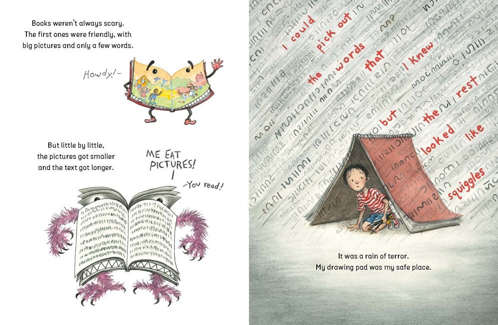When Hudson Talbott was a little boy, he loved drawing, and it came naturally to him. But reading? No way! One at a time, words weren't a problem, but long sentences were a struggle. As his friends moved on to thicker books, he kept his slow reading a secret. But that got harder every year. He felt alone, lost, and afraid in a world of too many words.