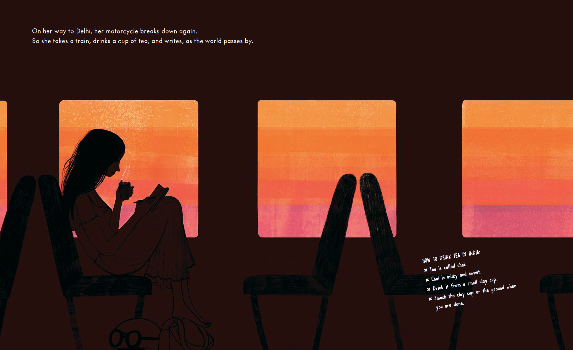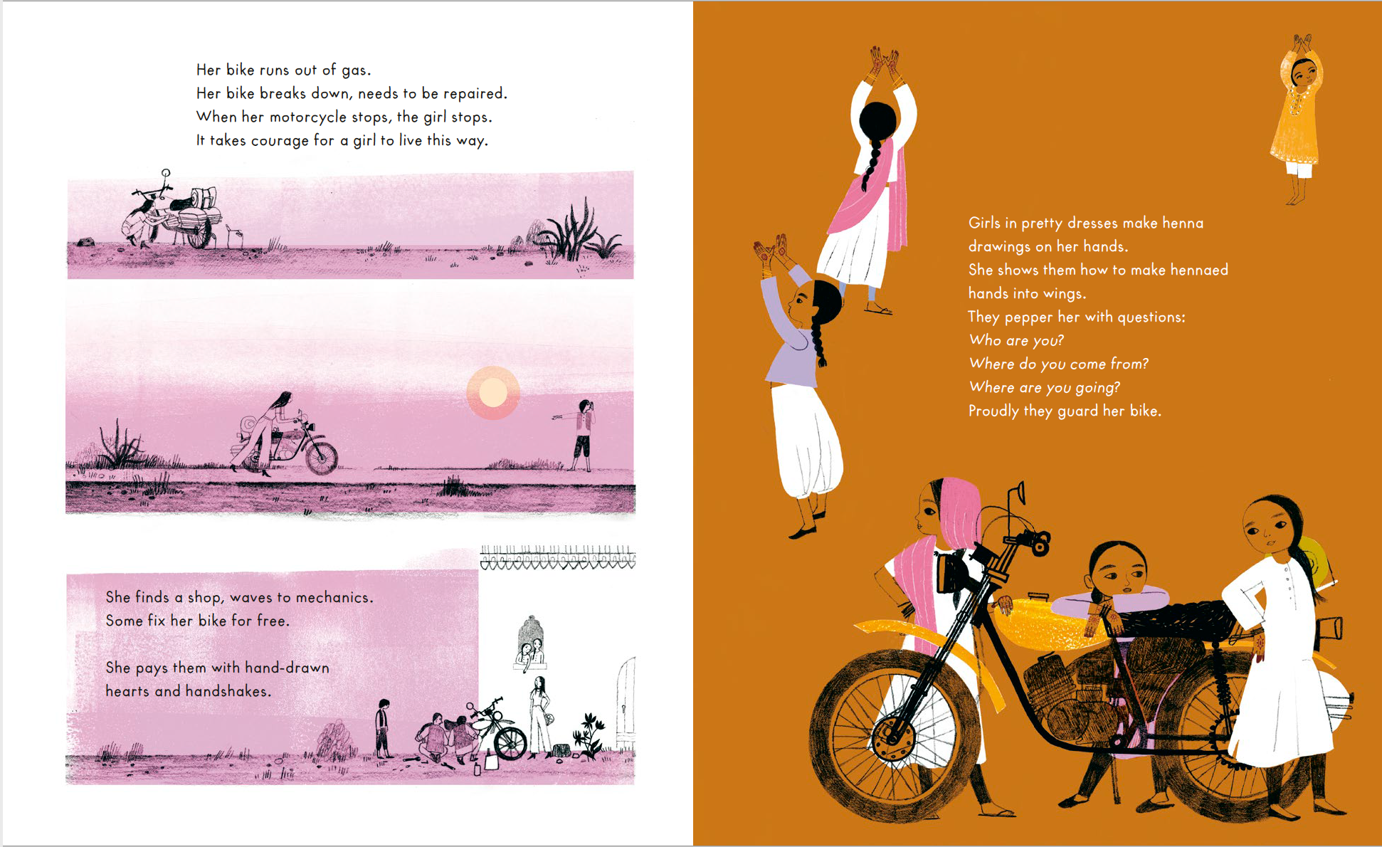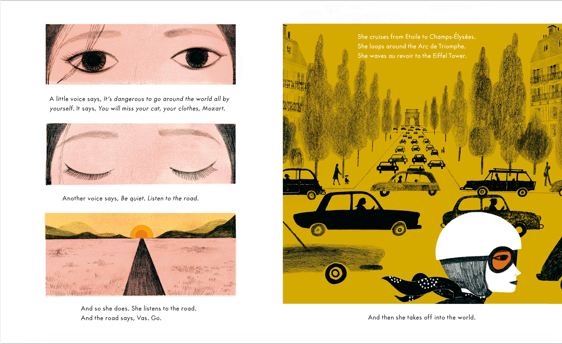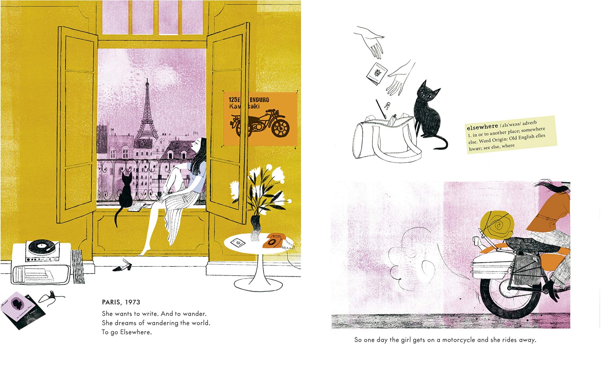 One day, a girl gets on her motorcycle and rides away. She wants to wander the world. To go . . . Elsewhere. This is the true story of the first woman to ride a motorcycle around the world alone. Each place has something to teach her. Each place is beautiful. And despite many flat tires and falls, she learns to always get back up and keep riding.