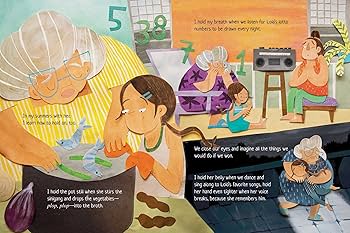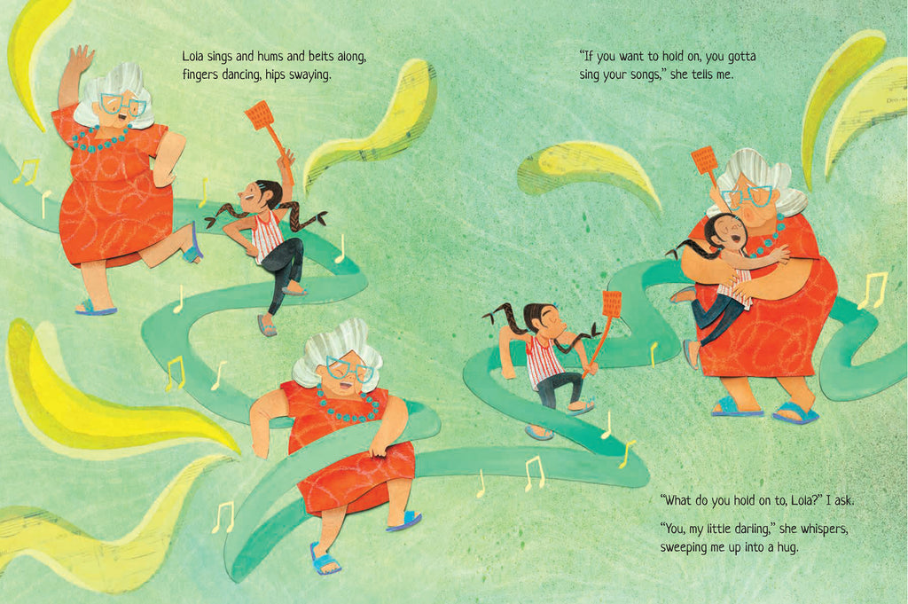 Her granddaughter tucks these sounds and Lola’s wisdom deep within her heart. And when Lola starts slipping into silence and stillness, she helps Lola hold on, piece by piece, with the joy and music that Lola taught her.