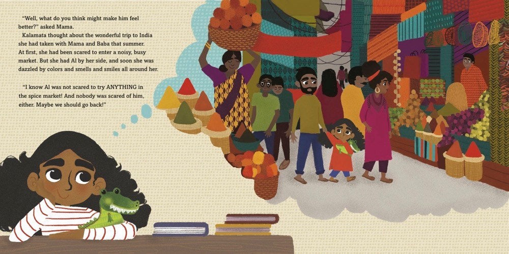 Tomorrow is Kalamata's first day at a new school, and she's nervous! What if the kids aren't friendly? Or worse, what if they don't like alligators!? If only Kalamata and Al Dente could go to back to the Indian spice market they visited this summer, then maybe she'd remember how to feel brave when new experiences seem scary.